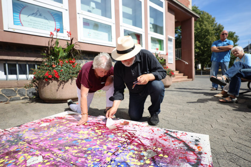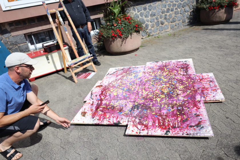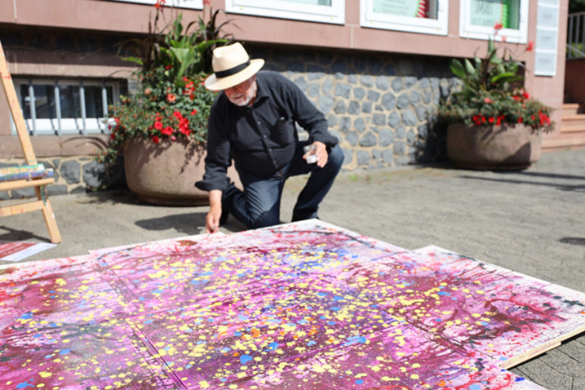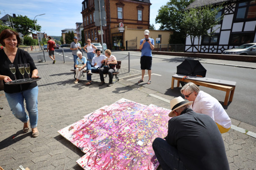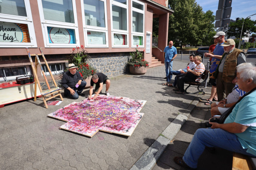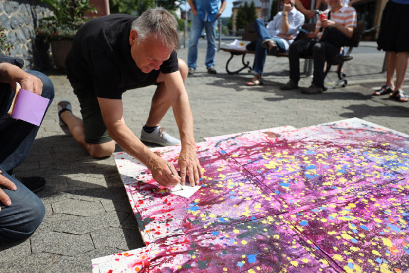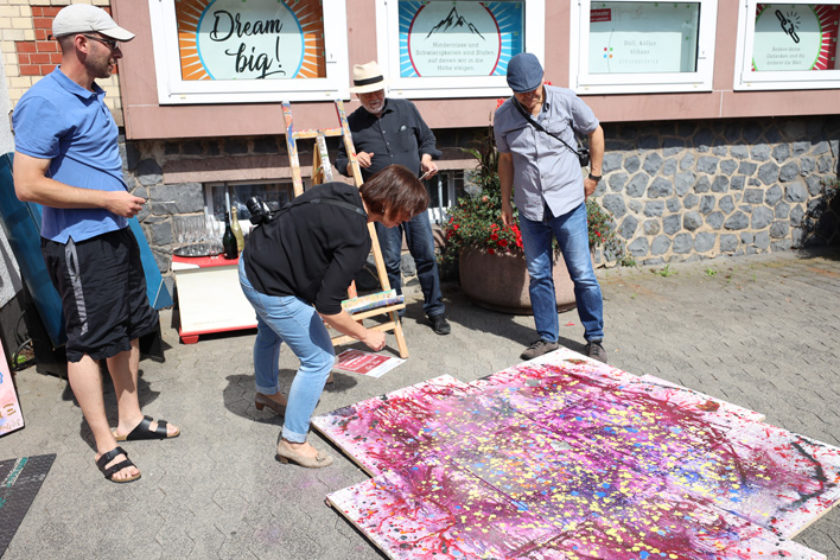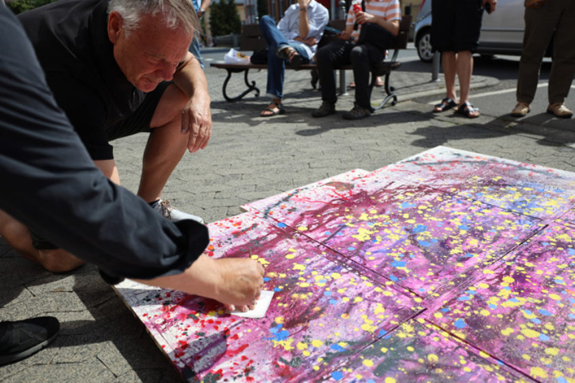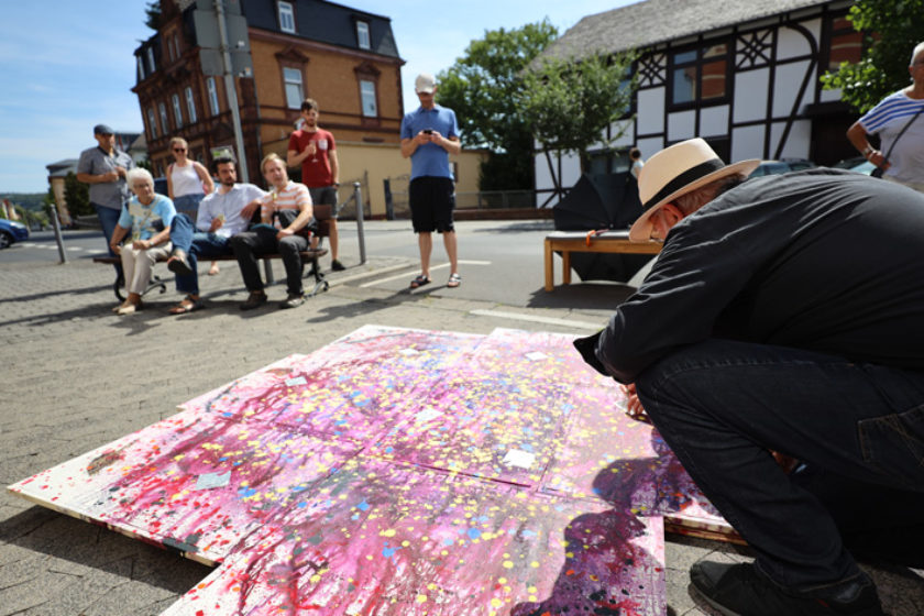 Vor der Buchhandlung „Lesezeichen“ in der Bahnhofstraße 42 fertigte Fritz Reith eine Installation mit dem Thema „Betröppelt“ an. Auf einer zirka zwei Quadratmeter großen und drehbaren Holzfläche ließ er verschiedene Farben aus entsprechenden Dosen auf die Fläche tröpfeln, wobei sein Sohn ständig die Holzpalette nach den Anweisungen seines Vaters drehte. Auf den weißen Untergrund trug er nacheinander helle Acrylfarben auf, die sich durch das Anheben der Platte nach allen Seiten ausbreiten konnten.