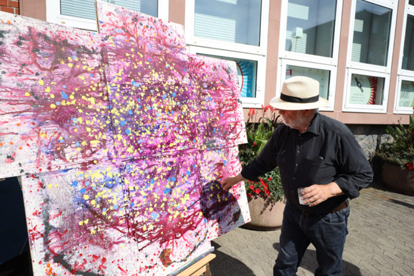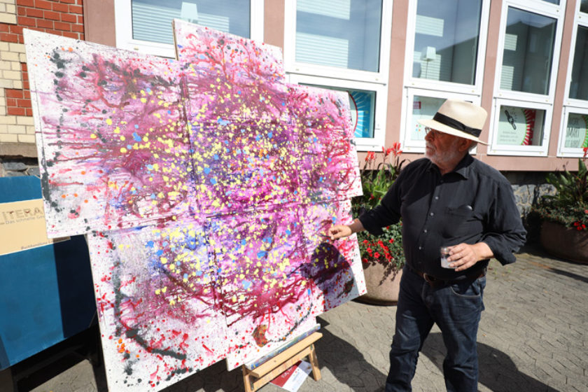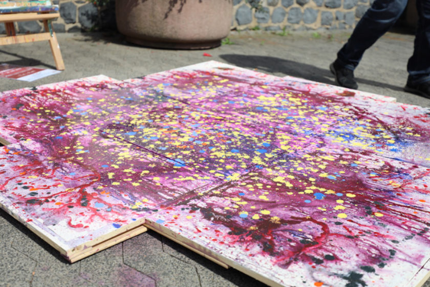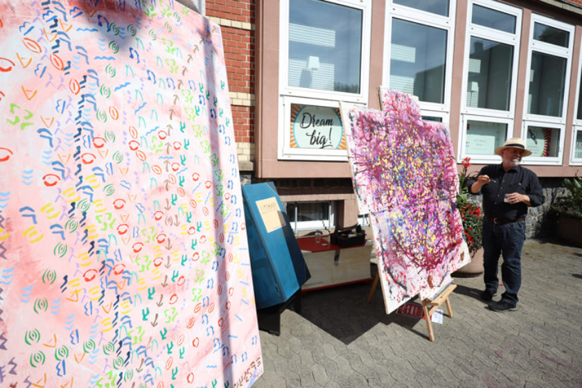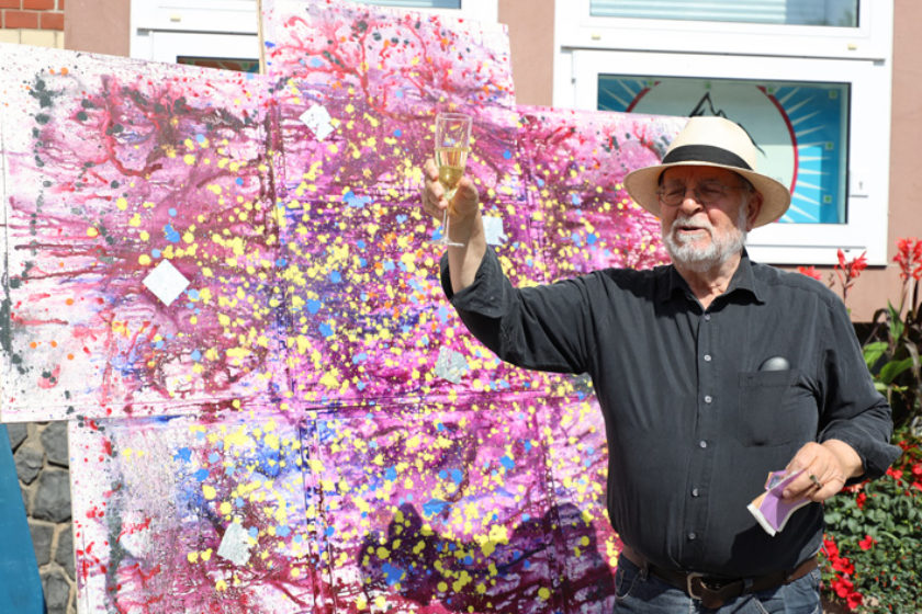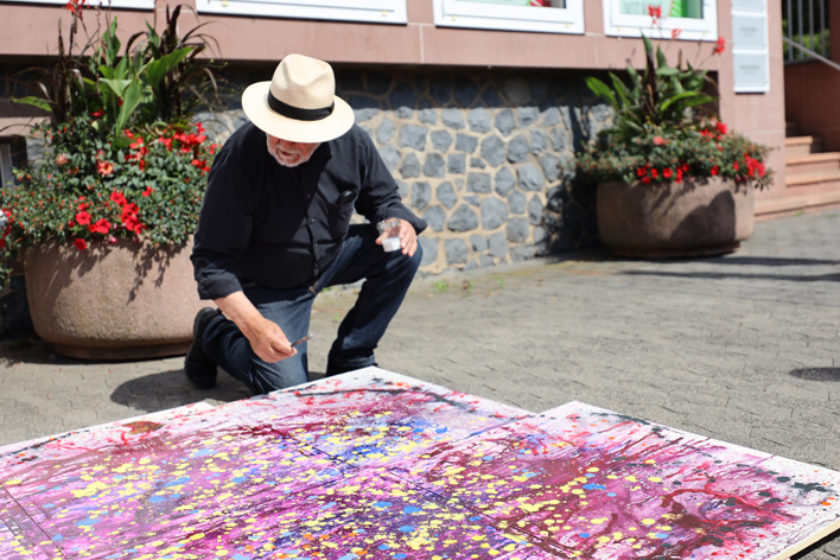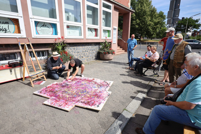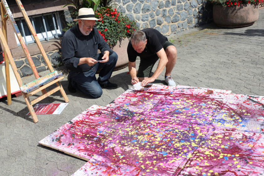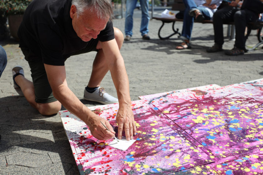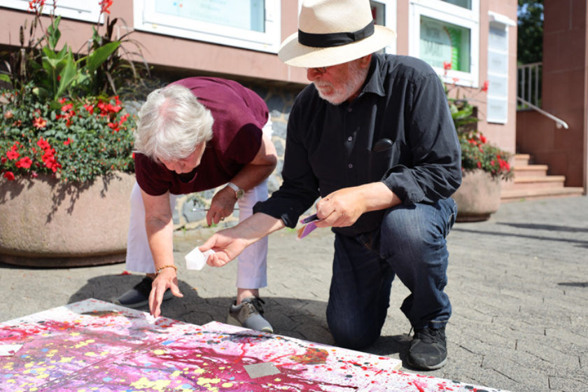 Vor der Buchhandlung „Lesezeichen“ in der Bahnhofstraße 42 fertigte Fritz Reith eine Installation mit dem Thema „Betröppelt“ an. Auf einer zirka zwei Quadratmeter großen und drehbaren Holzfläche ließ er verschiedene Farben aus entsprechenden Dosen auf die Fläche tröpfeln, wobei sein Sohn ständig die Holzpalette nach den Anweisungen seines Vaters drehte. Auf den weißen Untergrund trug er nacheinander helle Acrylfarben auf, die sich durch das Anheben der Platte nach allen Seiten ausbreiten konnten.