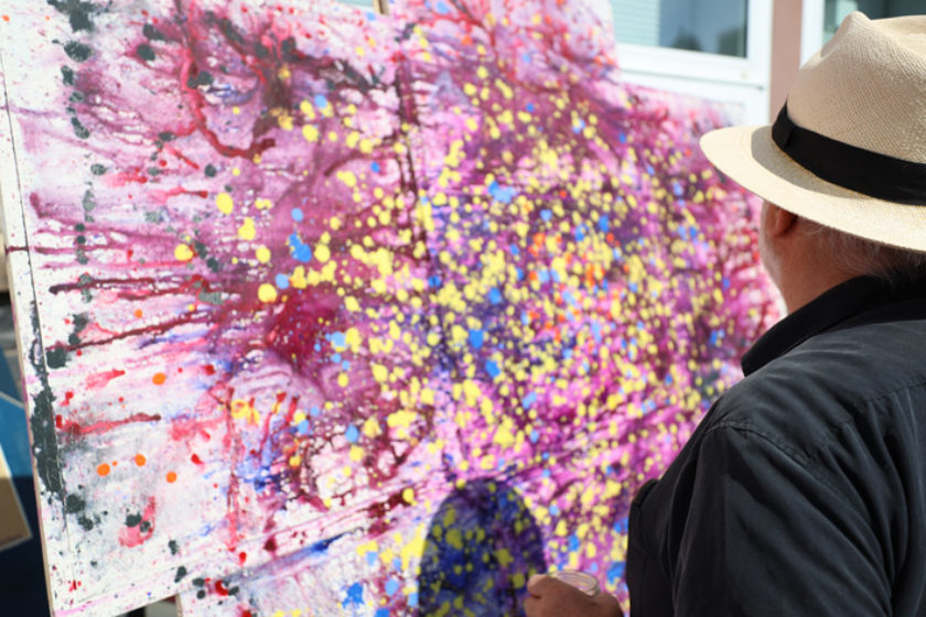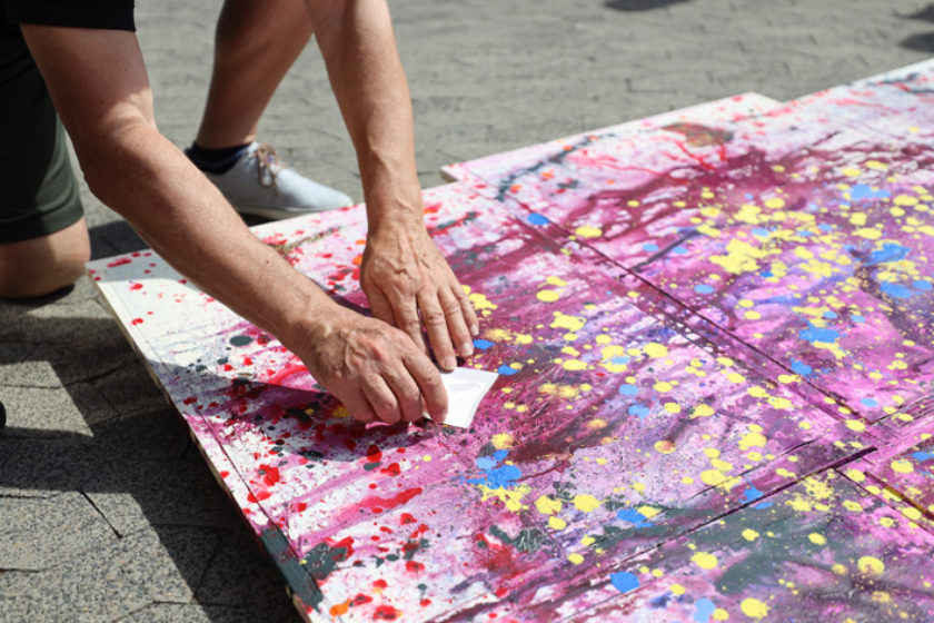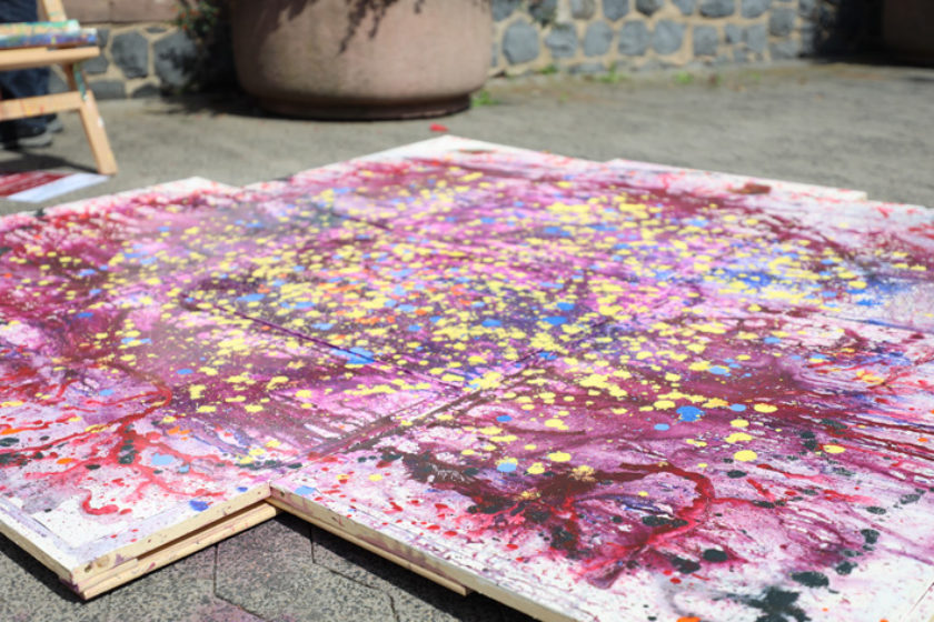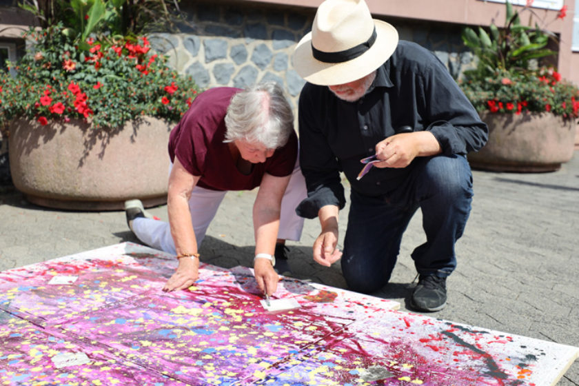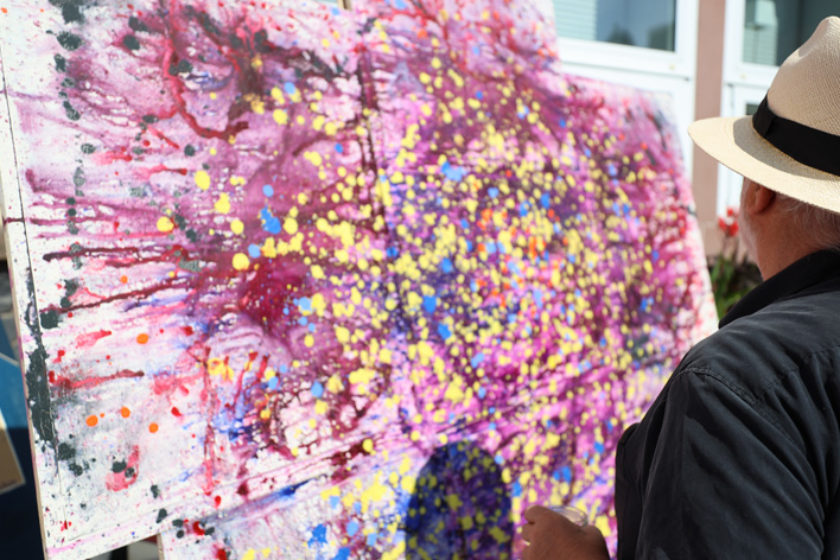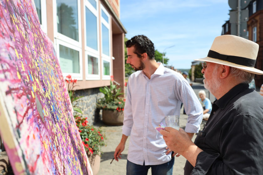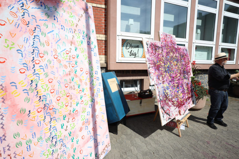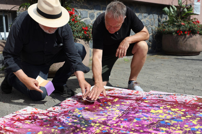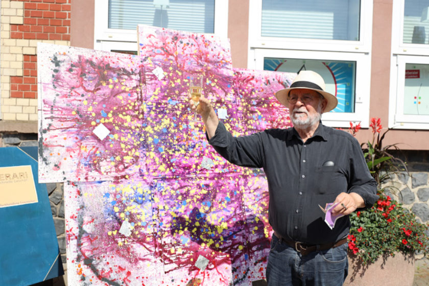 Vor der Buchhandlung „Lesezeichen“ in der Bahnhofstraße 42 fertigte Fritz Reith eine Installation mit dem Thema „Betröppelt“ an. Auf einer zirka zwei Quadratmeter großen und drehbaren Holzfläche ließ er verschiedene Farben aus entsprechenden Dosen auf die Fläche tröpfeln, wobei sein Sohn ständig die Holzpalette nach den Anweisungen seines Vaters drehte. Auf den weißen Untergrund trug er nacheinander helle Acrylfarben auf, die sich durch das Anheben der Platte nach allen Seiten ausbreiten konnten.