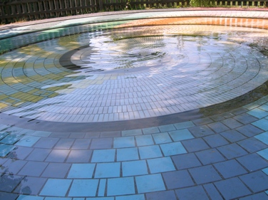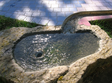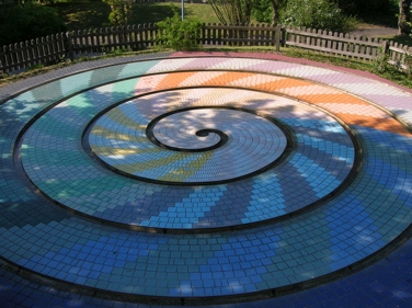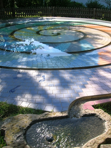 Aus einer Quelle in einem Basaltstein, im Osten liegend, durchfließt das Wasser als Zeichen des Lebens das farbige Mosaik spiralenförmig vom dunklen Rand zur helleren Mitte, in der es nach vier Umläufen versickert.