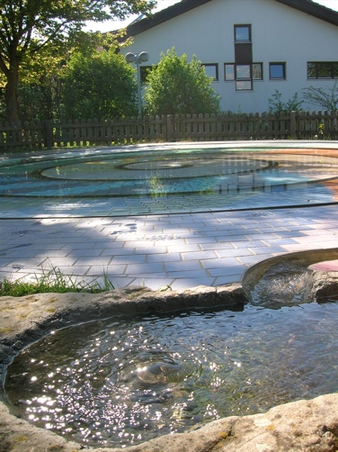 Der zur Mitte führende Meditationsweg, der begleitende und in der Mitte versiegende Wasserlauf und das Dunkel und Hell der Farben stellen die Botschaft unseres Lebens dar.